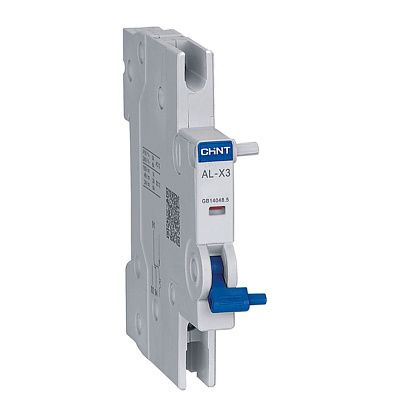 Предназначен для сигнализации аварийного срабатывания (перегрузка или короткое замыкание) автоматического выключателя. Контакт серии AL-X3 устанавливается с левой стороны выключателя и прищелкивается к нему. Контакты AL-X3 не меняют своего состояния, если выключатель отключен вручную. Возврат в исходное состояние после автоматического срабатывания происходит ручным сбросом (переключение механического рычажка на передней части корпуса контакта). Рычаг «тест» предназначен для имитации аварии во время обслуживания и проверки выключателей.