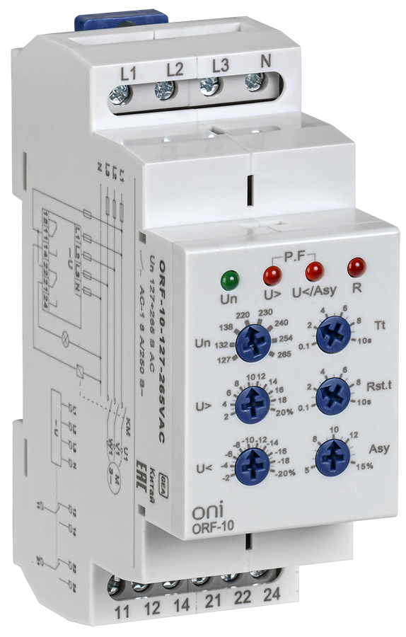 Реле контроля фаз ORF предназначены для контроля параметров трехфазной электрической сети (чередование фаз, обрыв фаз и нейтрали, асимметрия, повышенное и пониженное напряжение) и защиты чувствительных к этим параметрам потребителей. Реле осуществляет измерение напряжения на каждой фазе относительно нейтрали (L-N).