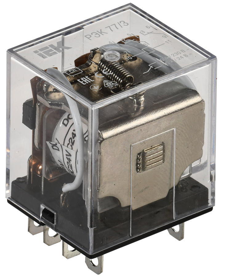 Реле промежуточные модульной серии РЭК77 и РЭК78 предназначены для передачи команд управления исполнительными элементами путем коммутации их электрических цепей своими переключающими контактами. Реле соединяются с розеточными модульными разъемами РРМ77 и РРМ78, устанавливаемыми на 35-мм монтажной DIN-рейке. На разъемах расположены зажимы выводов переключающих контактов и катушки. В реле применяются серебросодержащие контакты.