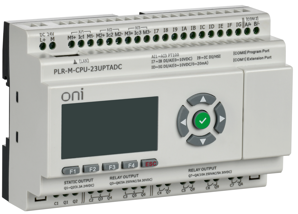 Микро ПЛК ONI. Расширяемая версия. Со встроенным экраном. 10 входов (4 как 0...20 мА или 0...10 В DC, 2 как 0-10 В, 4 DI, 2 из которых до 60 кГц), 3 температурных входа Pt100, 2 транзисторных выхода до 10кГц, 8 релейных выходов. Часы реального времени RTC. Архивация данных процесса при использовании стандартной SD карты. Интегрированы 2 интерфейса RS485 и 1 интерфейс Ethernet с поддержкой Modbus TCP/RTU/ASCII и MQTT протоколов. Напряжение питания 24В DC.