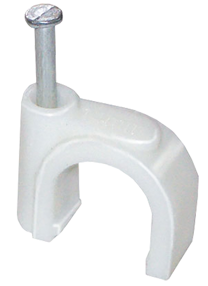 Скоба с гвоздём предназначена для быстрого и надежного крепления круглых кабелей к дереву, прессованному картону, швам кирпичной кладки, к штукатурке, бетону, кирпичу. Изготовлены из гибкого негорючего ударопрочного полипропилена, гвоздь - закаленная оцинкованная сталь.