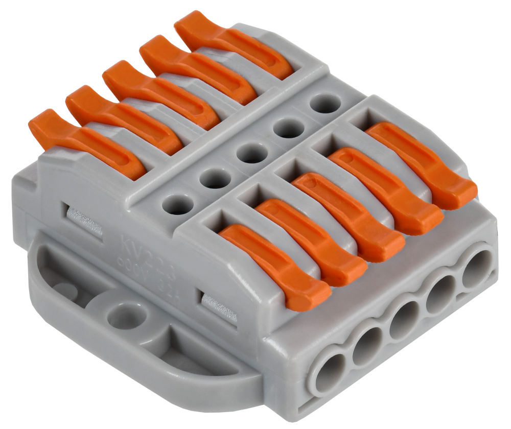 Клемма строительно-монтажная проходная с площадкой серии 222 предназначена для соединения одножильных и многожильных медных проводников без использования инструмента в электрических сетях переменного и постоянного тока. Клемма допускает многократное присоединение и отсоединение проводников. Количество подключаемых проводников - 5/5.