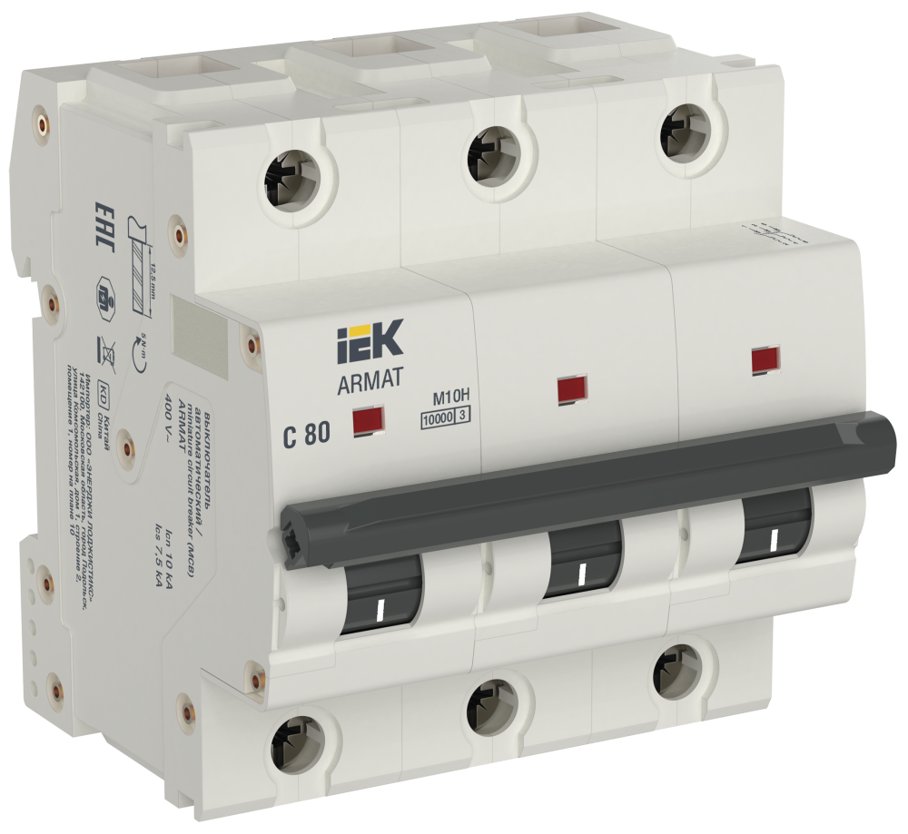 Автоматические выключатели ARMAT серии M10H предназначены для защиты цепей от перегрузки и короткого замыкания. Модельный ряд включает в себя устройства с характеристиками срабатывания B, C, D и Z, L, K на номинальные токи 80 и 100 А с числом полюсов от 1Р до 4Р. Номинальная наибольшая отключающая способность автоматических выключателей ARMAT серии M10H составляет 10 кА. Автоматические выключатели ARMAT серии M10H соответствуют ГОСТ IEC 60947-2 и ГОСТ IEC 60898-1. Конструкцией автоматических выключателей ARMAT серии M10H обеспечивается двойной разрыв контактной системы и двойная дугогасительная камера с совокупным числом де-ионных пластин 24, это двукратно увеличивает падение напряжения на электрической дуге в момент коммутации, за счет чего достигается быстрое и эффективное дугогашение.