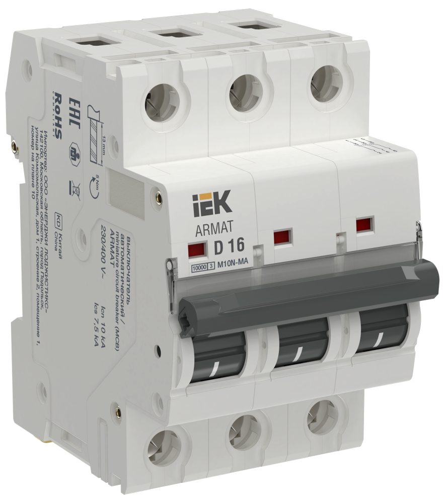 Автоматические выключатели без теплового расцепителя ARMAT серии M10N MA предназначены для защиты цепей от короткого замыкания. Основная область применения выключателя - системы аварийной вентиляции и пожаротушения. Модельный ряд включает в себя устройства с характеристиками срабатывания C, D на номинальные токи от 1А до 63А с числом полюсов 1Р, 2Р, 3Р. Номинальная наибольшая отключающая способность автоматических выключателей ARMAT серии M10N MA составляет 10 кА.