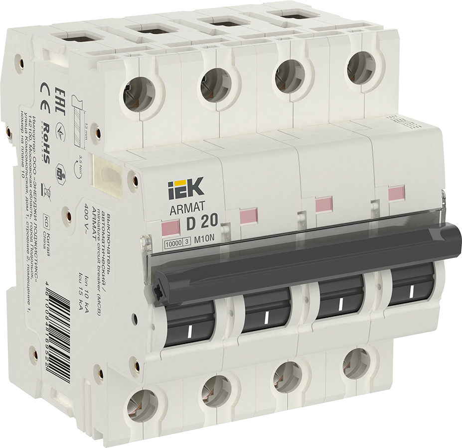 Автоматические выключатели ARMAT серии M10N предназначены для защиты цепей от перегрузки и короткого замыкания. Модельный ряд включает в себя устройства с характеристиками срабатывания B, C, D и номинальными токами от 0,5 до 63 А. Номинальная отключающая способность автоматических выключателей ARMAT серии M10N составляет 10 кА. Предельная отключающая способность варьируется в зависимости от номинала от 10 до 50 кА.