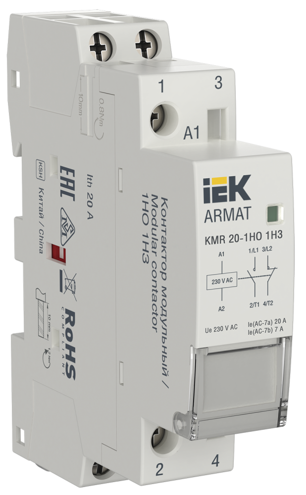 Контакторы модульные типа KMR ARMAT разработаны специально для коммутации цепей освещения, управления системами отопления, электродвигателями и насосным оборудованием. Контакторы имеют следующий ряд номинального напряжения цепи управления: 12, 24, 48, 230 В. Контакторы имеют следующий ряд номинального тока в категории применения АС-1 (AC-7a): 16, 20, 25, 40, 63, 100 А. Бесшумная работа катушки управления и отсутствие постороннего звука и вибрации контактов – это отличительные преимущества данной линейки. Наличие в ассортименте универсальной катушки управления (AC/DC) и дополнительных контактов расширяет применимость в различных областях.