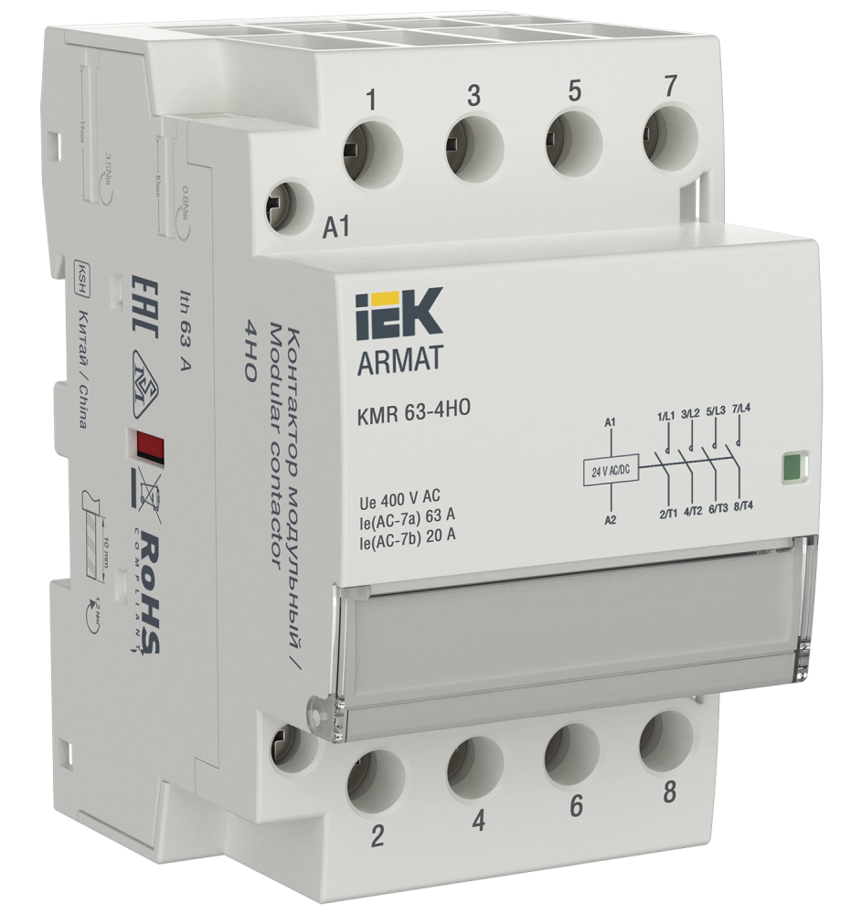 Контакторы модульные типа KMR ARMAT разработаны специально для коммутации цепей освещения, управления системами отопления, электродвигателями и насосным оборудованием. Контакторы имеют следующий ряд номинального напряжения цепи управления: 12, 24, 48, 230 В. Контакторы имеют следующий ряд номинального тока в категории применения АС-1 (AC-7a): 16, 20, 25, 40, 63, 100 А. Бесшумная работа катушки управления и отсутствие постороннего звука и вибрации контактов – это отличительные преимущества данной линейки. Наличие в ассортименте универсальной катушки управления (AC/DC) и дополнительных контактов расширяет применимость в различных областях.
