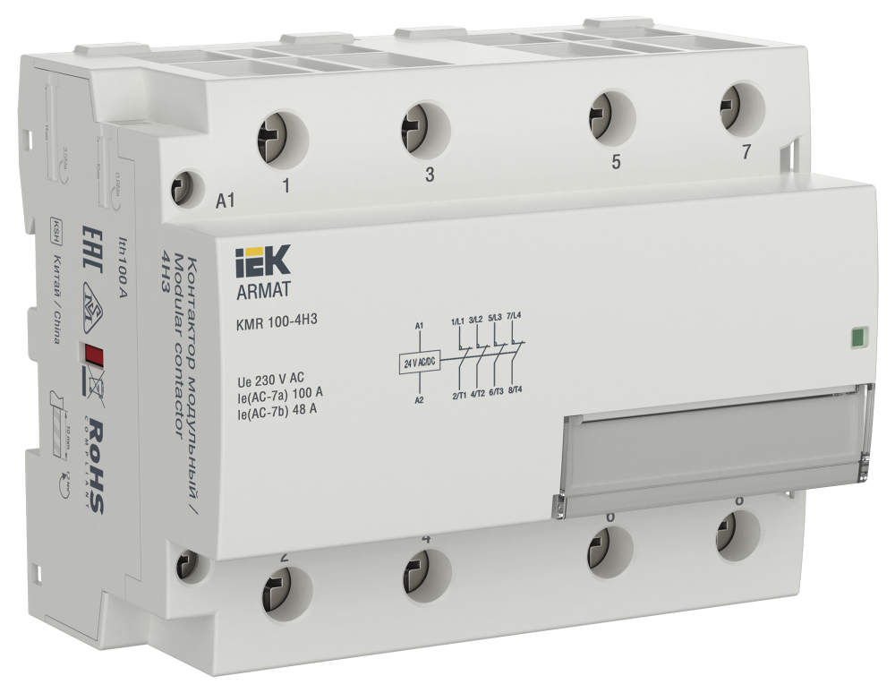 Контакторы модульные типа KMR ARMAT разработаны специально для коммутации цепей освещения, управления системами отопления, электродвигателями и насосным оборудованием. Контакторы имеют следующий ряд номинального напряжения цепи управления: 12, 24, 48, 230 В. Контакторы имеют следующий ряд номинального тока в категории применения АС-1 (AC-7a): 16, 20, 25, 40, 63, 100 А. Бесшумная работа катушки управления и отсутствие постороннего звука и вибрации контактов – это отличительные преимущества данной линейки. Наличие в ассортименте универсальной катушки управления (AC/DC) и дополнительных контактов расширяет применимость в различных областях.