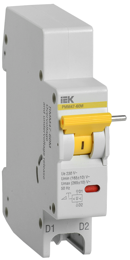 Расцепитель минимального/максимального напряжения РММ47-60М предназначен для отключения одно-, двух- или трехполюсного автоматического выключателя серии ВА47-60М при недопустимом снижении или повышении напряжения сети.