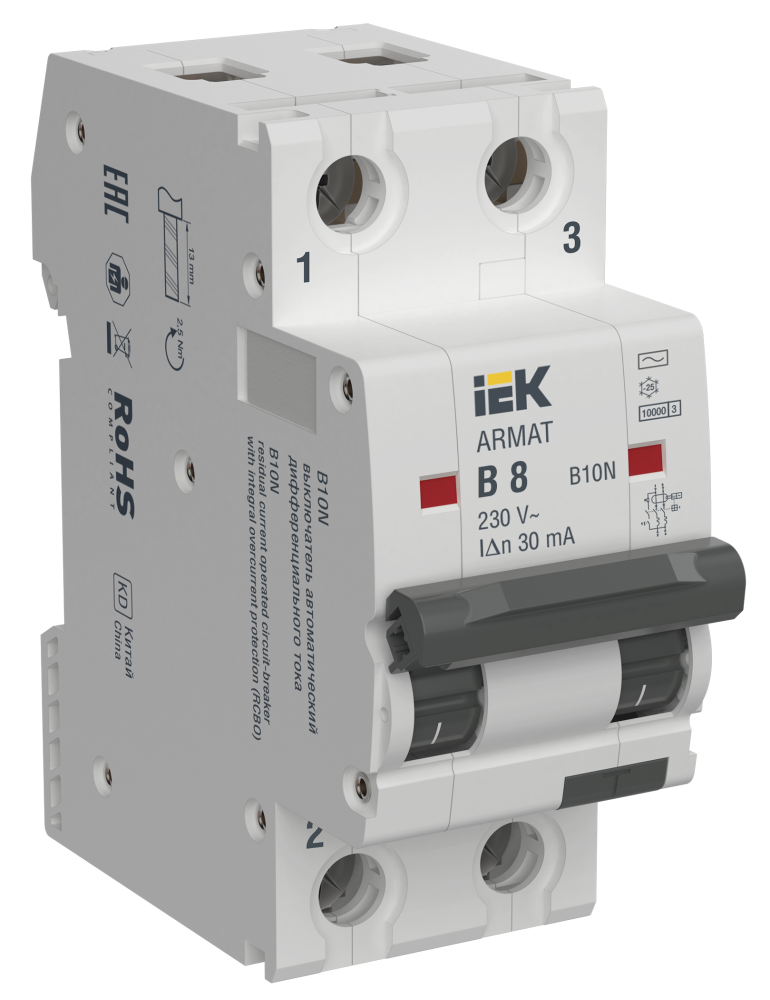 Автоматические выключатели дифференциального тока (АВДТ) ARMAT серии B10N - надежное решение для промышленности, энергетики и бытового применения. B10N функционально не зависят от напряжения сети, что обеспечивает функциональную работу даже в случае исчезновения нуля. Номинальная наибольшая отключающая способность 10 кА гарантирует надежную работу устройства даже при высоких токах короткого замыкания. Топология полюсов B10N 2P означает, что функции защиты от токов перегрузки и короткого замыкания, а также дугогасительная ферромагнитная решетка реализованы в каждом полюсе. Независимый механизм свободного расцепления с мгновенной коммутацией обеспечивает безопасное включение, а защитная шторка исключает неправильное подключение и ошибку при монтаже. Подключение шинами PIN и FORK реализовано сверху и снизу устройства. B10N позволяет присоединять любые дополнительные модульный устройства ARMAT серии AUX. Модельный ряд включает в себя устройства с номинальными токами от 8 до 32 А, характеристиками срабатывания по сверхтоку B и C, типами защит AC и A с номинальными дифференциальными токами отключения 30, 100, 300 мА.