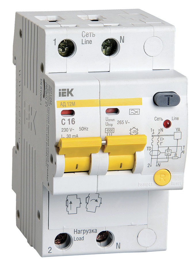 Быстродействующие защитные выключатели обеспечивают: в исполнении с уставками срабатывания 10 и 30 мА: - защиту людей от поражения электрическим током при прямом непреднамеренном прикосновении к токоведущим частям электрооборудования; в исполнении с уставками срабатывания 100 и 300 мА: – защиту от пожара из-за возгорания изоляции токоведущих частей; – защиту от перегрузки и короткого замыкания; – защиту от недопустимого повышения напряжения сети (АД12М). В изделиях предусмотрена индикация срабатывания от дифференциального тока, а для АД12М также светодиодная индикация включенного состояния. АД12М сохраняет работоспособность при снижении напряжения электрической сети до 110 В. В качестве коммутационных аппаратов в изделиях использованы выключатели автоматические ВА47-29 новой серии.