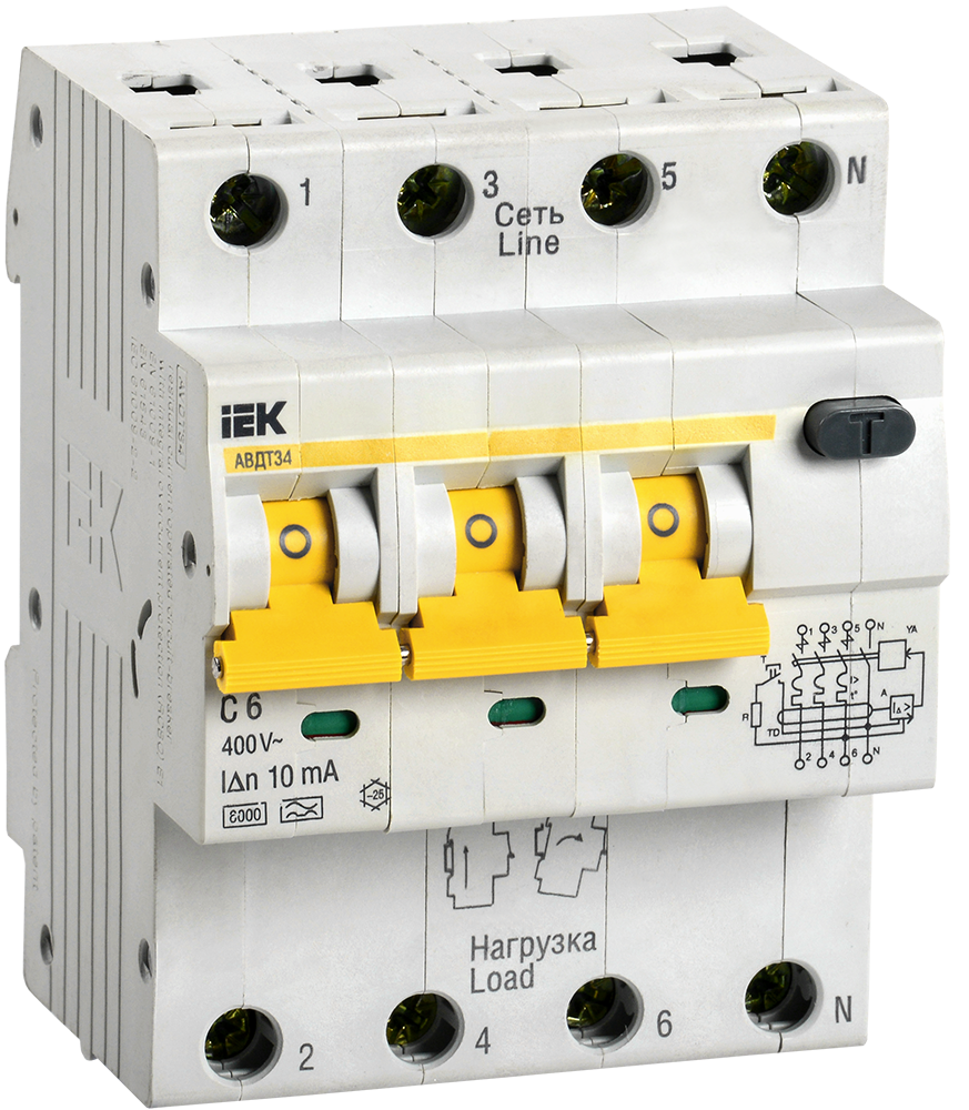 - Номинальный условный ток короткого замыкания 6000А позволяет устанавливать автоматические выключатели дифференциального тока АВДТ34 в качестве вводных автоматов защиты.