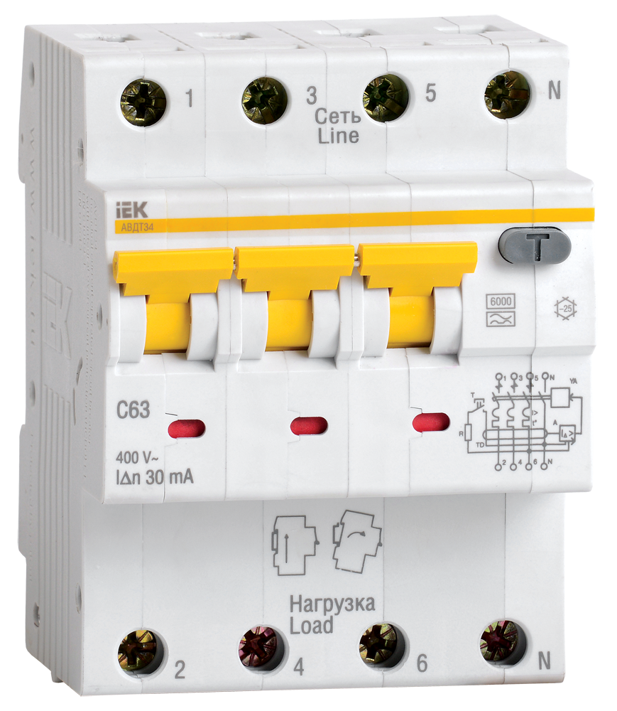 - Номинальный условный ток короткого замыкания 6000А позволяет устанавливать автоматические выключатели дифференциального тока АВДТ34 в качестве вводных автоматов защиты.