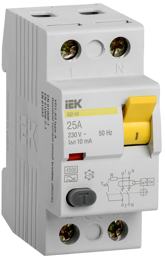 - Широкий ассортимент номинальных токов (16А, 25А, 32А, 40А, 50А, 63А) и номинальных отключающих дифференциальных токов (10мА, 30мА, 100мА).