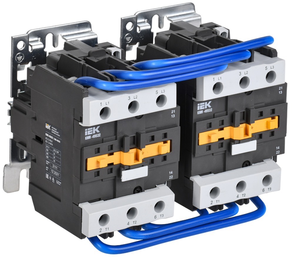Контакторы КМИ (реверс) IEK используются для пуска, остановки и реверсирования асинхронных электродвигателей, а также для дистанционного управления цепями освещения, нагревательными цепями и различными малоиндуктивными нагрузками (категория применения АС-1). Поставляются с заводскими шинами и механической блокировкой.