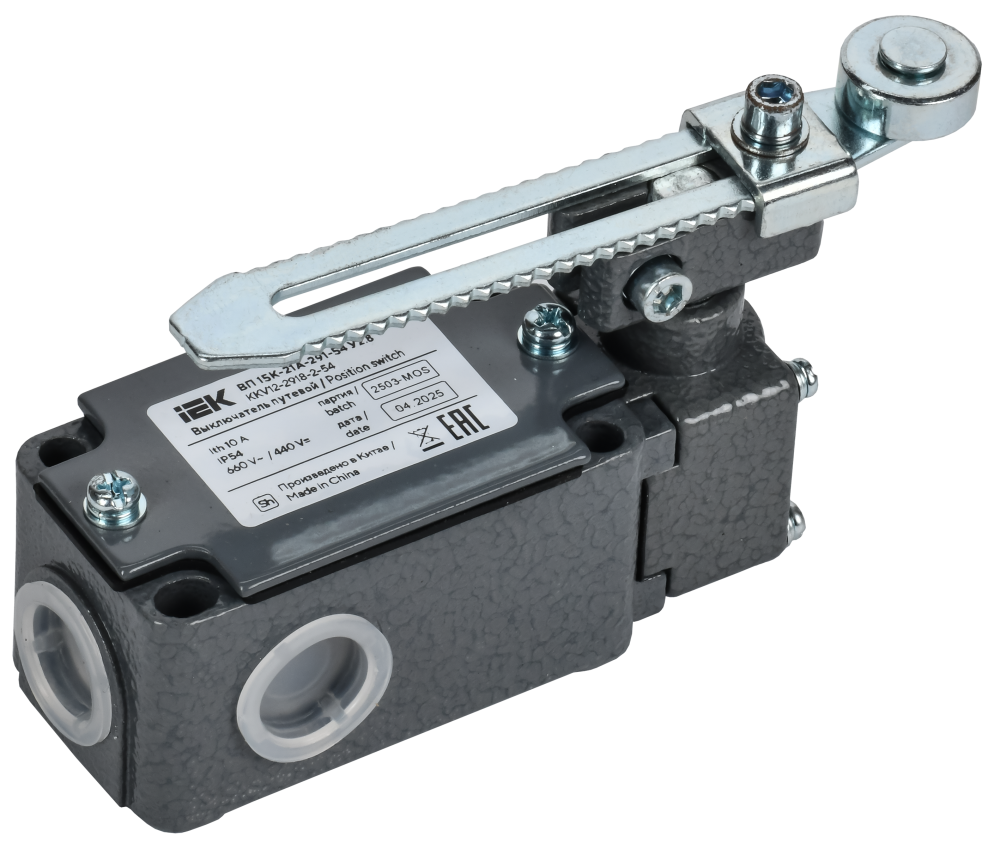 Выключатели путевые ВП15К товарного знака IEK (далее — выключатель) предназначены для коммутации электрических цепей управления переменного и постоянного тока под воздействием управляющих упоров в определенных точках пути контролируемого объекта. Они срабатывают при достижении механизмами заданных точек, размыкая или переключая электрические цепи управления. Эти выключатели играют ключевую роль в безопасности, предотвращая аварии и защищая оборудование от повреждений из-за перегрузок или нештатных ситуаций. Их применяют в лифтах, конвейерах, станках, автоматических воротах и других системах, где важен четкий контроль движения. Выключатель соответствует требованиям ТР ТС 004/2011, ГОСТ IEC 60947-5-1.
