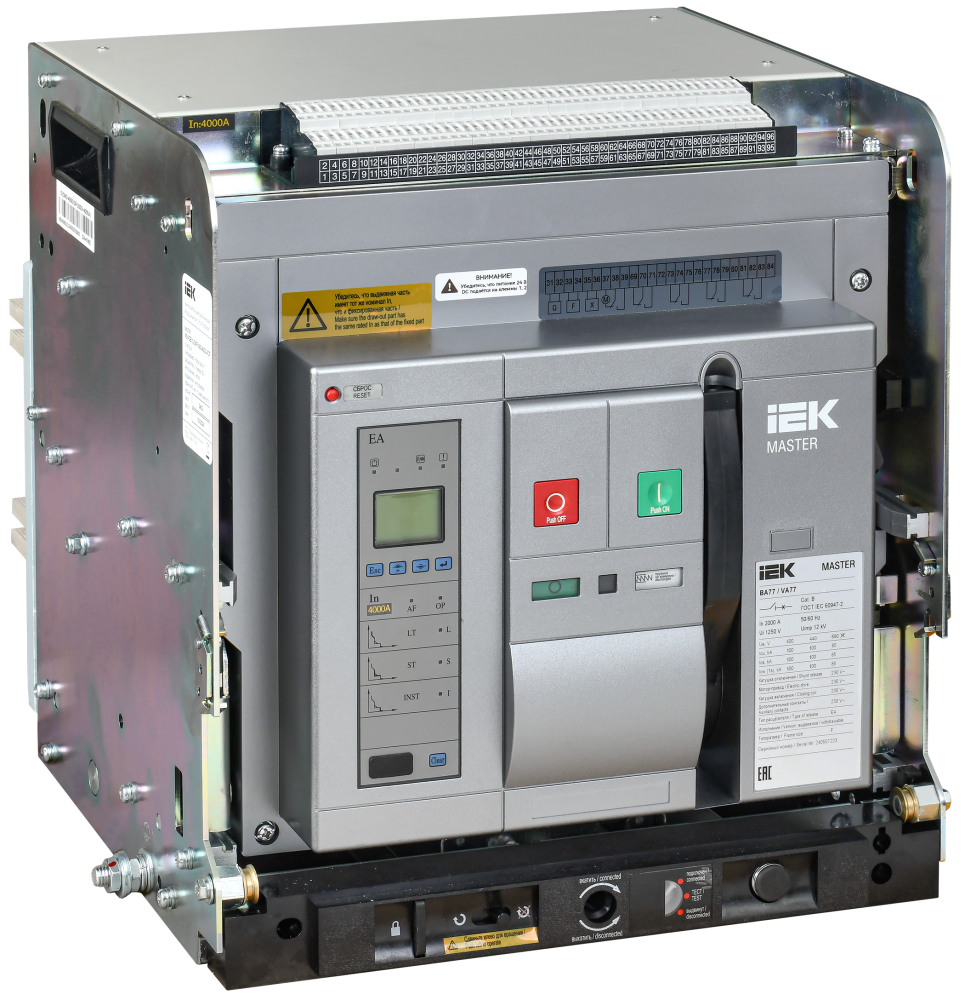 Воздушные автоматические выключатели серии MASTER IEK предназначены для защиты сетей низкого напряжения от коротких замыканий и перегрузок. Автоматические выключатели данной серии обладают оптимальным набором функций, для применения их на объектах жилищного, социального, коммерческого и дорожного строительства, а также энергетики и сельского хозяйства. Воздушные автоматические выключатели серии MASTER IEK поставляются укомплектованными набором аксессуаров для их полноценного применения в состав НКУ: мотор привод 230В, реле включения и отключения (с удержанием) 230В, контакт положения в корзине, набор из 4х перекидных контактов, аварийный контакт. В комплект автоматического выключателя также входит электронный контроллер и, в случае выдвижного исполнения база выдвижного исполнения.
