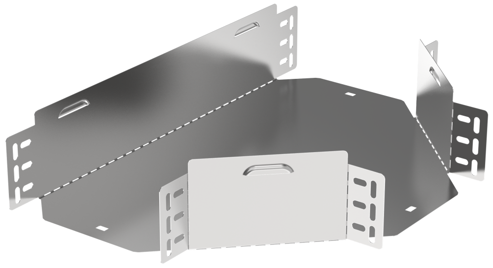 Разветвитель Т-образный горизонтальный предназначен для организации Т-образного ответвления кабельной трассы в горизонтальной плоскости. Аксессуар поставляется в плоском виде, имеет направляющую перфорацию для сгиба и сборки изделия перед установкой. Стыковка аксессуара с лотком осуществляется за счёт телескопического соединителя. Подходит для всех типов листовых лотков серии ESCA. Крышка на аксессуар заказывается отдельно. Аксессуар изготовлен из стали оцинкованной методом Сендзимира (защитный слой цинка не менее 5-10 мкм).