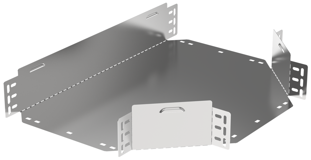 Разветвитель Т-образный горизонтальный предназначен для организации Т-образного ответвления кабельной трассы в горизонтальной плоскости. Аксессуар поставляется в плоском виде, имеет направляющую перфорацию для сгиба и сборки изделия перед установкой. Стыковка аксессуара с лотком осуществляется за счёт телескопического соединителя. Подходит для всех типов листовых лотков серии ESCA. Крышка на аксессуар заказывается отдельно. Аксессуар изготовлен из стали оцинкованной методом Сендзимира (защитный слой цинка не менее 5-10 мкм).