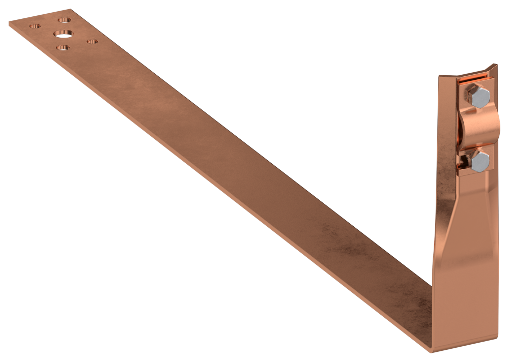 Держатель проводника круглого для черепичной кровли с болтовым зажимом предназначен для закрепления прутка на черепичной, мягкой и шиферной кровле. Держатель крепится к рейкам крыши при помощи метизов. Фиксация проводника происходит при помощи болтового соединения перпендикулярно длинной стороне держателя. Материал корпуса - медь.