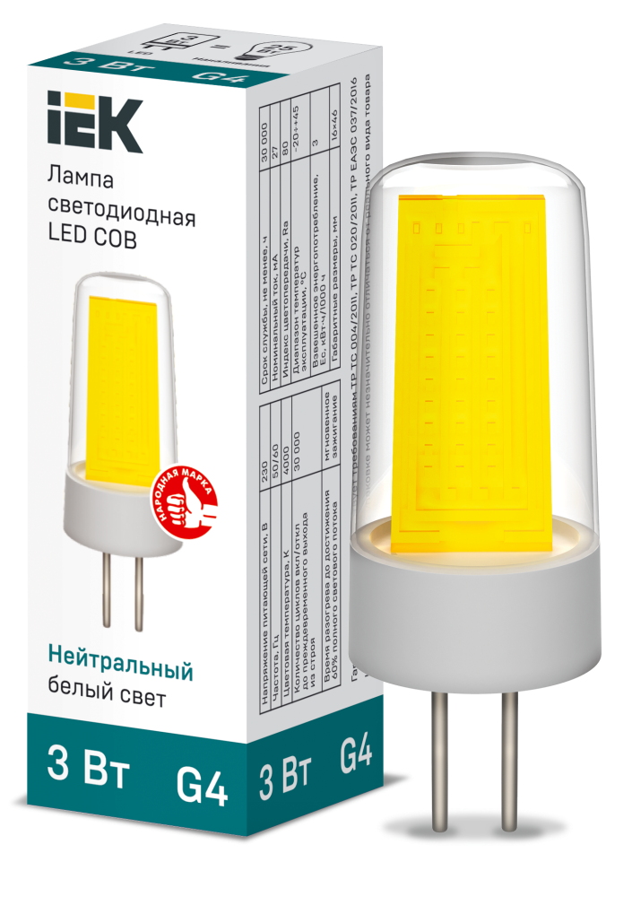 Светодиодная капсульная лампа LED COB капсула 3Вт 230В 4000К керамика G4 IEK является заменой капсульных галогенных ламп соответствующего цоколя и используются как для основного освещения жилых и коммерческих помещений, так и для точечной и акцентной подсветки.