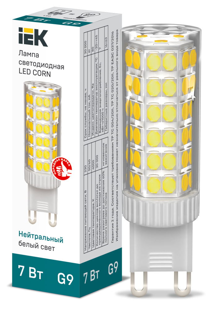 Светодиодная капсульная лампа LED CORN капсула 7Вт 230В 4000К керамика G9 IEK является заменой капсульных галогенных ламп соответствующего цоколя и используются как для основного освещения жилых и коммерческих помещений, так и для точечной и акцентной подсветки.